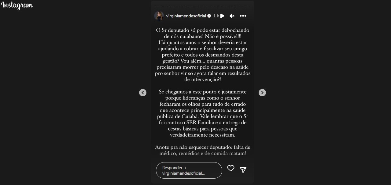 Na postagem, Virginia diz que o parlamentar “nunca fez nada” para evitar que o caos se instalasse na rede pública da Capital. “Se chegamos a esse ponto é justamente porque lideranças como o senhor fecharam os olhos para tudo de errado que acontece principalmente na saúde pública de Cuiabá”, escreveu.