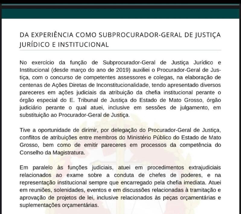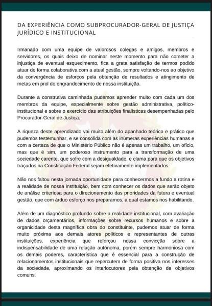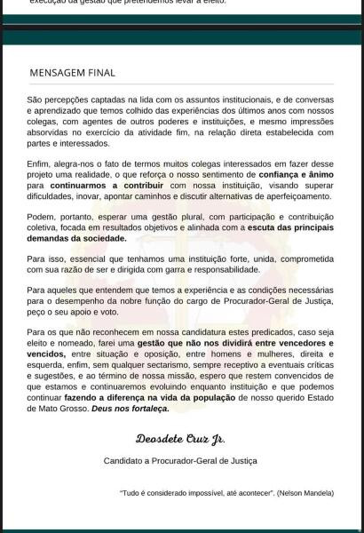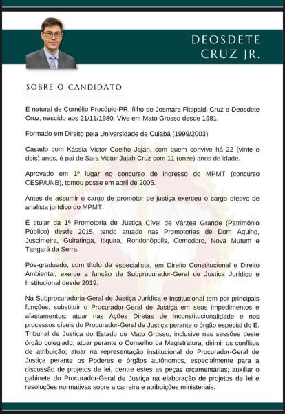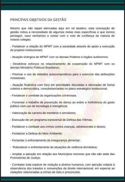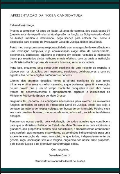 Além de apresentar seu currículo, a carta de Deosdete elenca os principais objetivos de sua possível gestão. O subprocurador-geral afirma que pretende fortalecer o combate às organizações criminosas e aos crimes contra crianças, adolescentes e idosos, além de robustecer a atuação do MPMT nos casos de violência doméstica.
