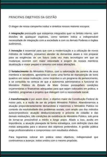 “Pautaremos nossa gestão pela valorização de todos aqueles que contribuem para que o Ministério Público do Estado de Mato Grosso sirva com eficiência e grandeza aos propósitos fixados pelo constituinte, e trabalharemos arduamente para conferir, aos membros e servidores, as condições indispensáveis para uma excelente execução de nosso ministério, e que todos, independentemente de gênero, raça, orientação sexual e religião, engajemo-nos nesse firme propósito, o de buscar justiça e de promover transformação social”, diz o candidato.